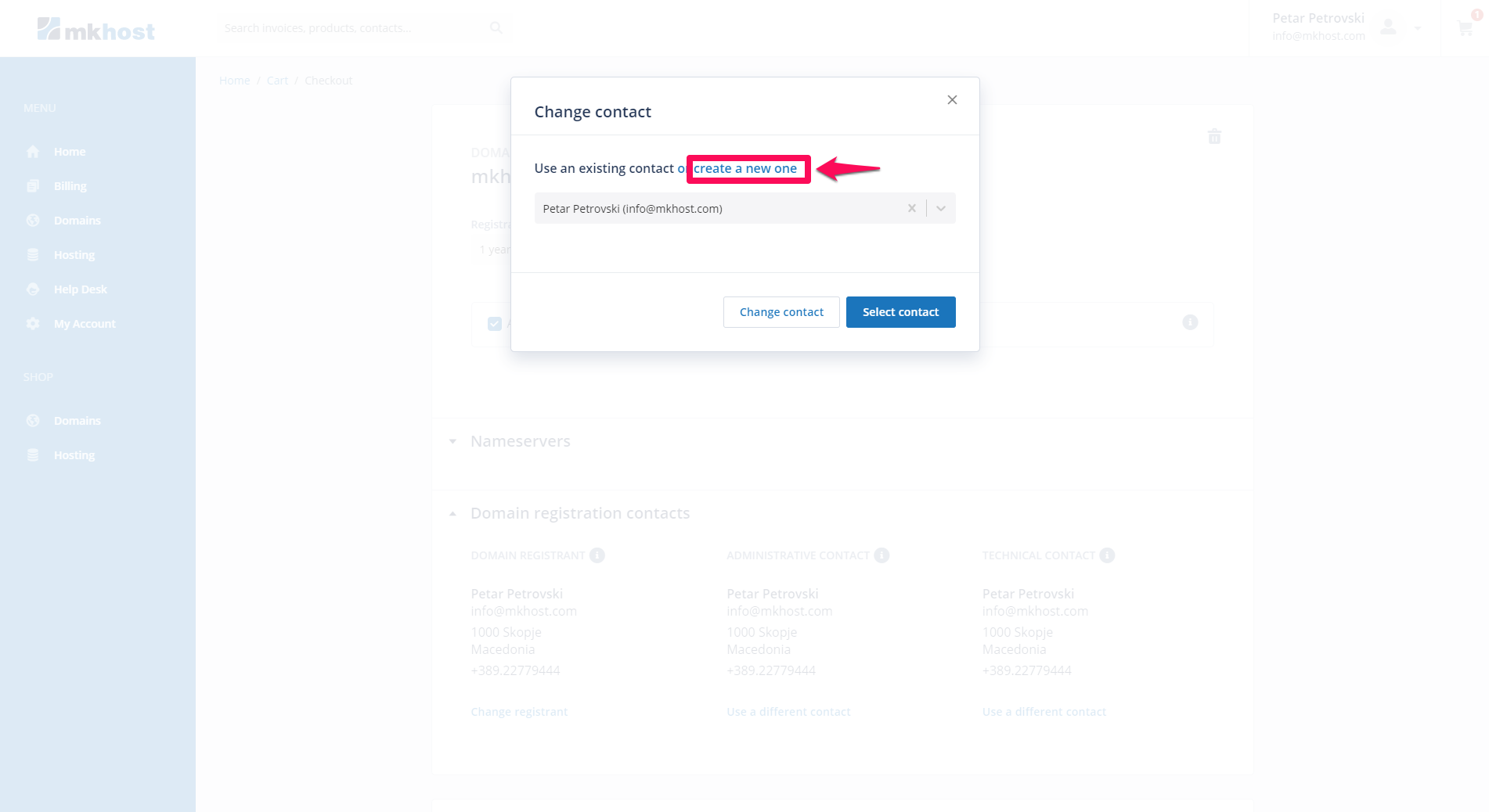 By default the registrant contact, administrative and technical contact is the information from the owner of the account. If you want to change the registrant please click on Change registrant . Form the pop up please select an existing contact you want to register the domain or create a new contact by clicking on create a new one.