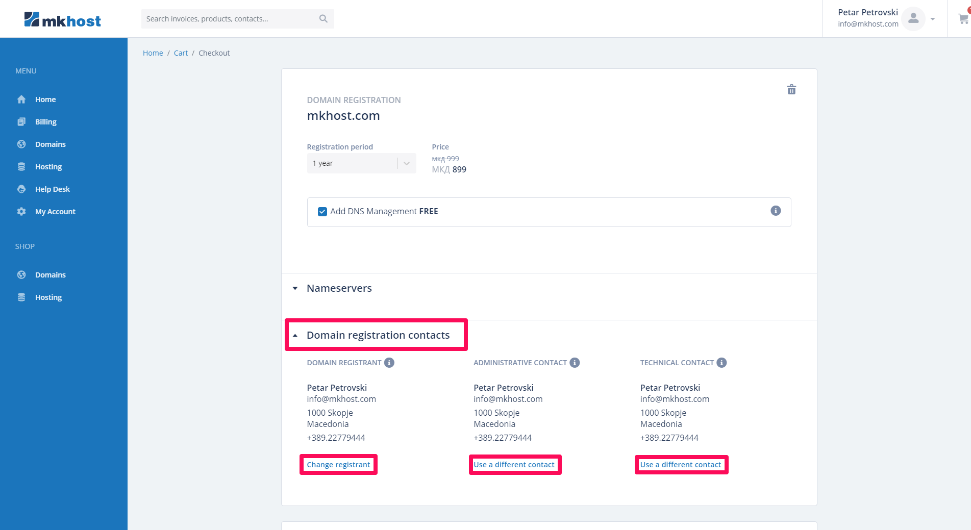 The new window is very important in the process of ordering. In Domain registration contacts you can put the information you want to register the domain to. The name of the registrant, address, phone, email. You can also set up different information for administrative/technical contact here. Please note that the information you enter here will be the information in which the domain will be registered and shown in who is for that particular domain.