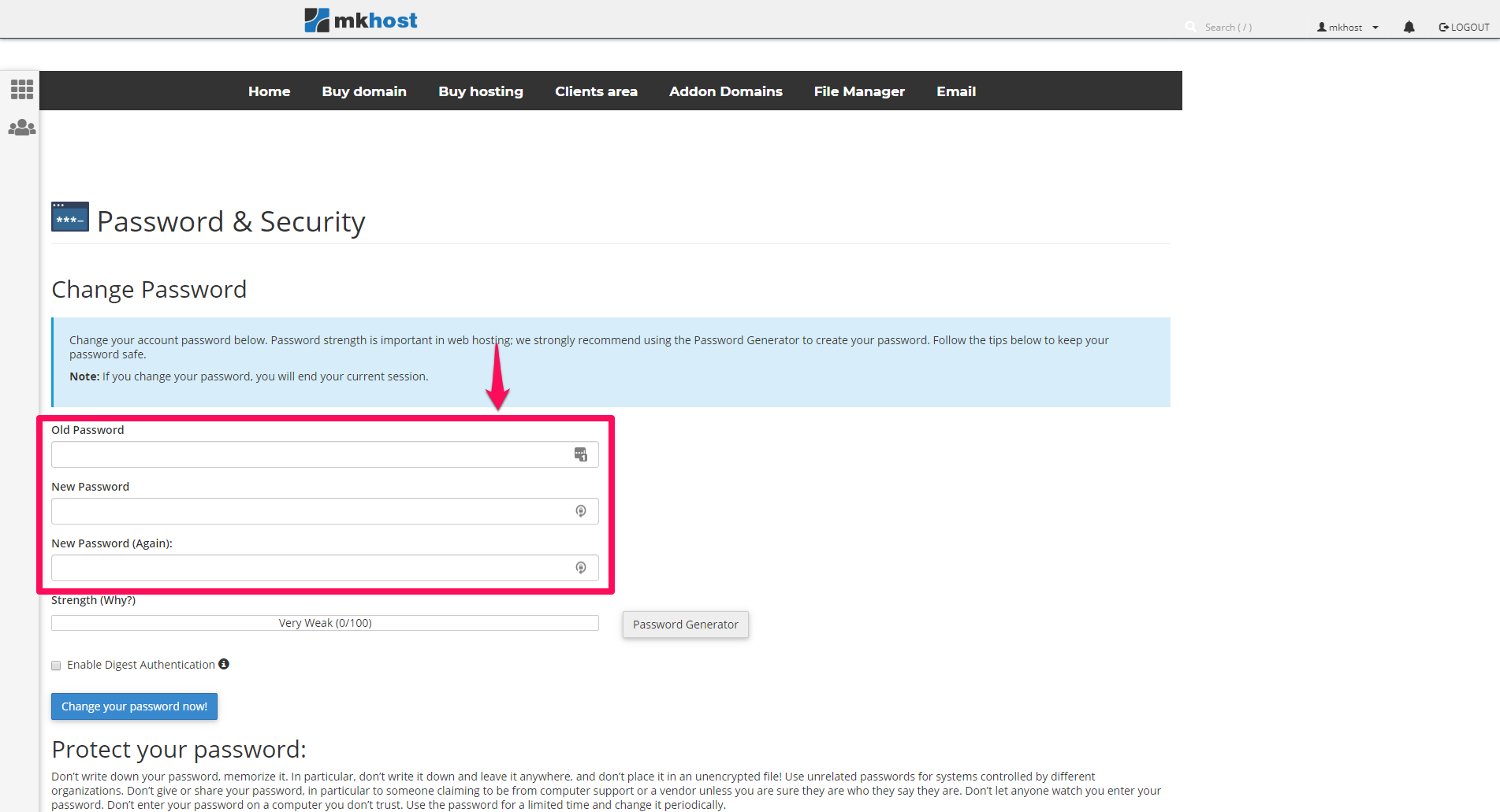 In the newly opened window enter the old password and just below it enter a new password that will sign in to your cPanel account in the future and click Change your password now.