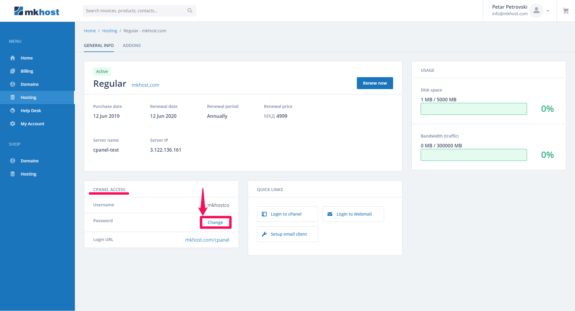 A second way to change your hosting password is through your user account.
