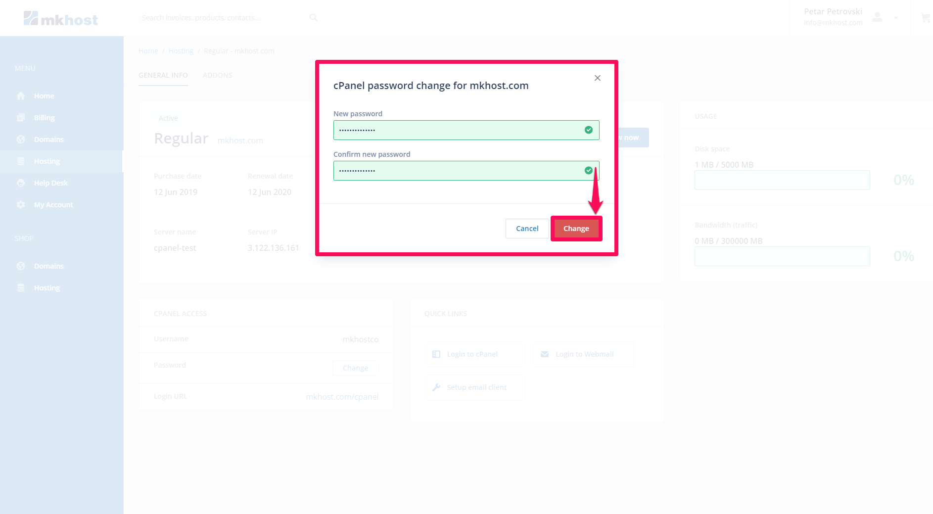 When you click the Change button, a new Change cPanel Password window will open, enter the new password and click on Change.