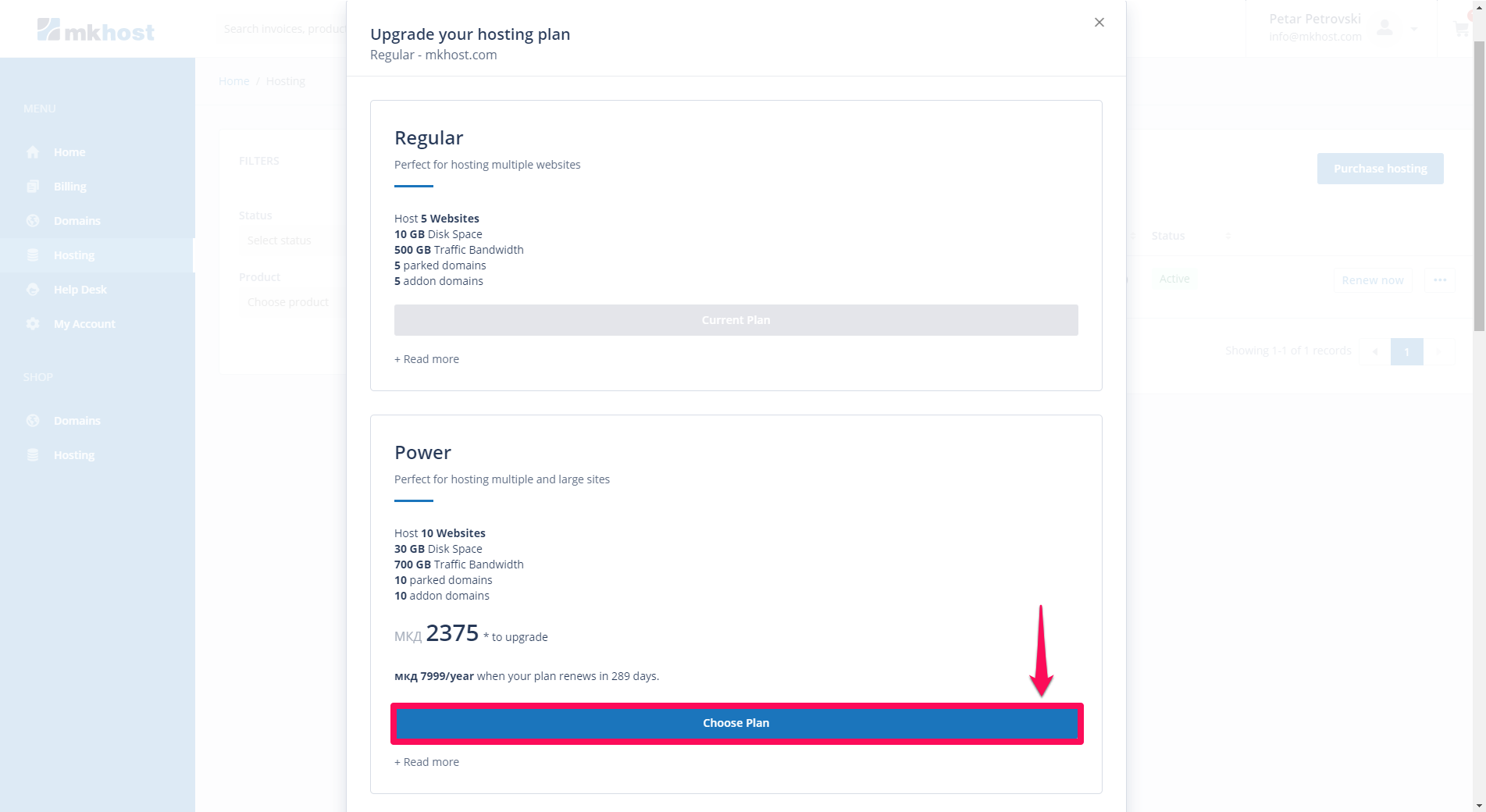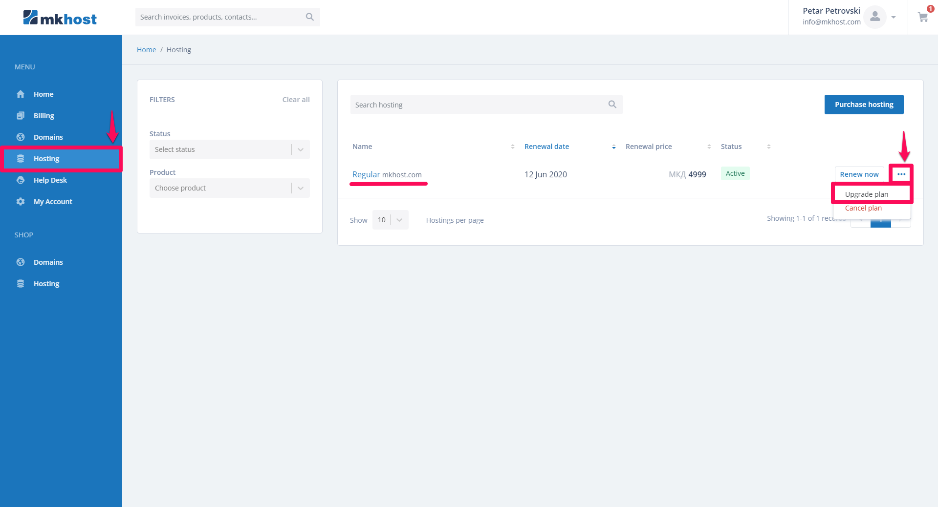 Log in to your account on portal.mkhost.com. Click on Hosting from the Menu . Choose the hosting plan you want to upgrade click on the button … then click on upgrade plan. From the new pop-up windows choose the new hosting plan and click on Choose plan