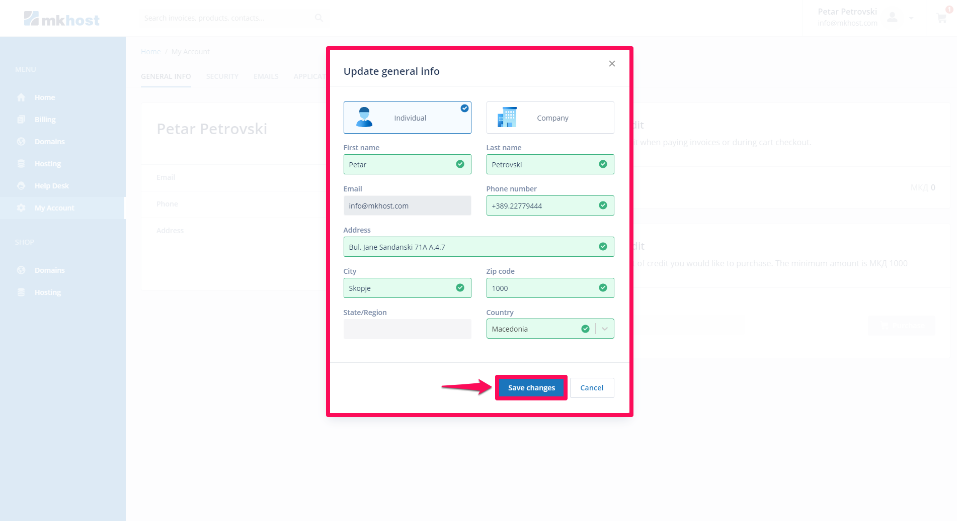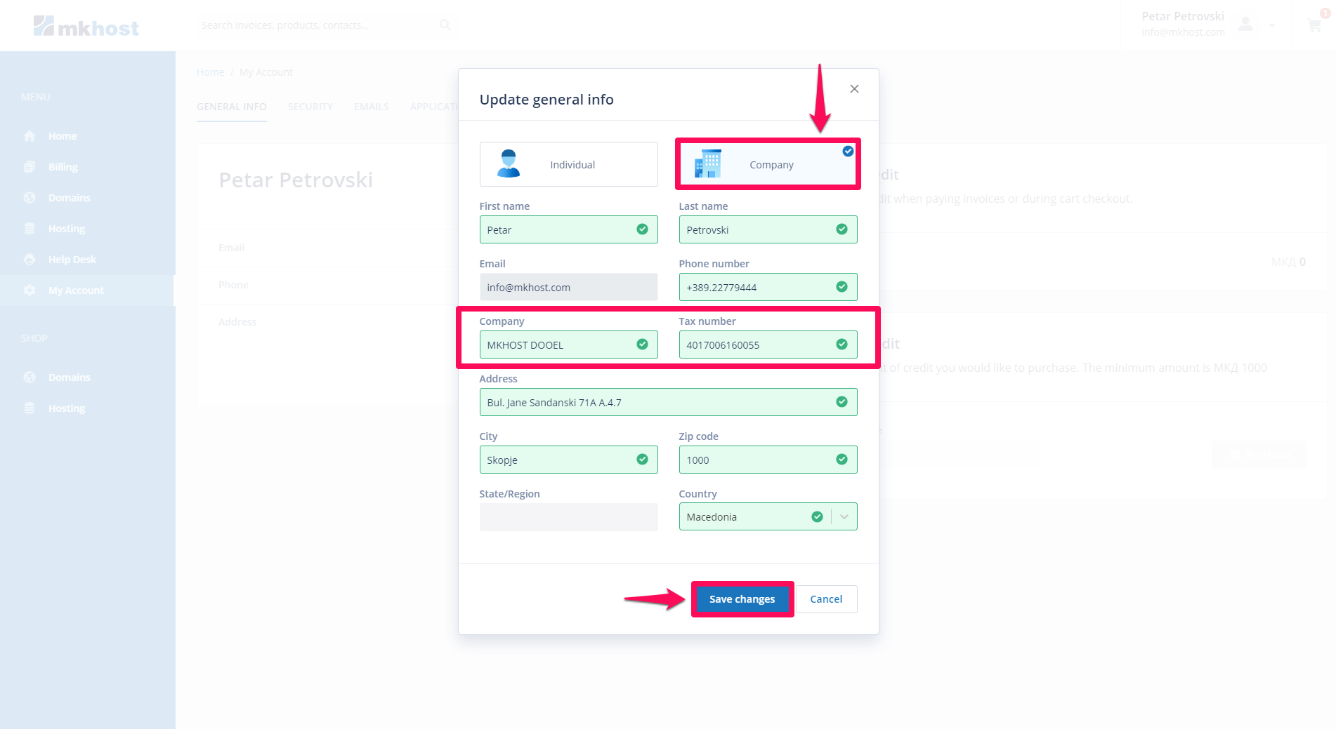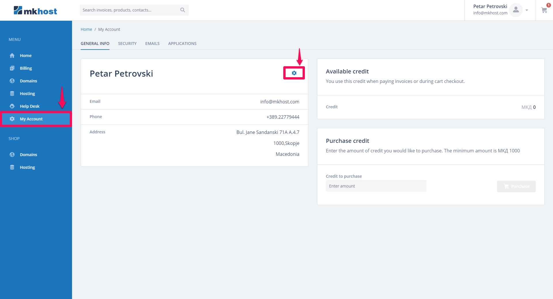 At any time you can change / update all your client information in your profile except the email address. In order to change the main email address for you account please write us an email form the current email address to info@mkhost.com.mk and we will make the change for you.