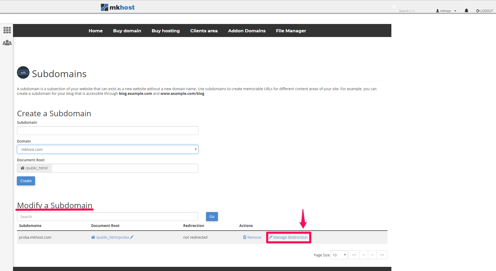 If you want to redirect the subdomain to another domain, click the Manage Redirection button and enter the link to which you want the subdomain to be redirected, then click on the Save button.