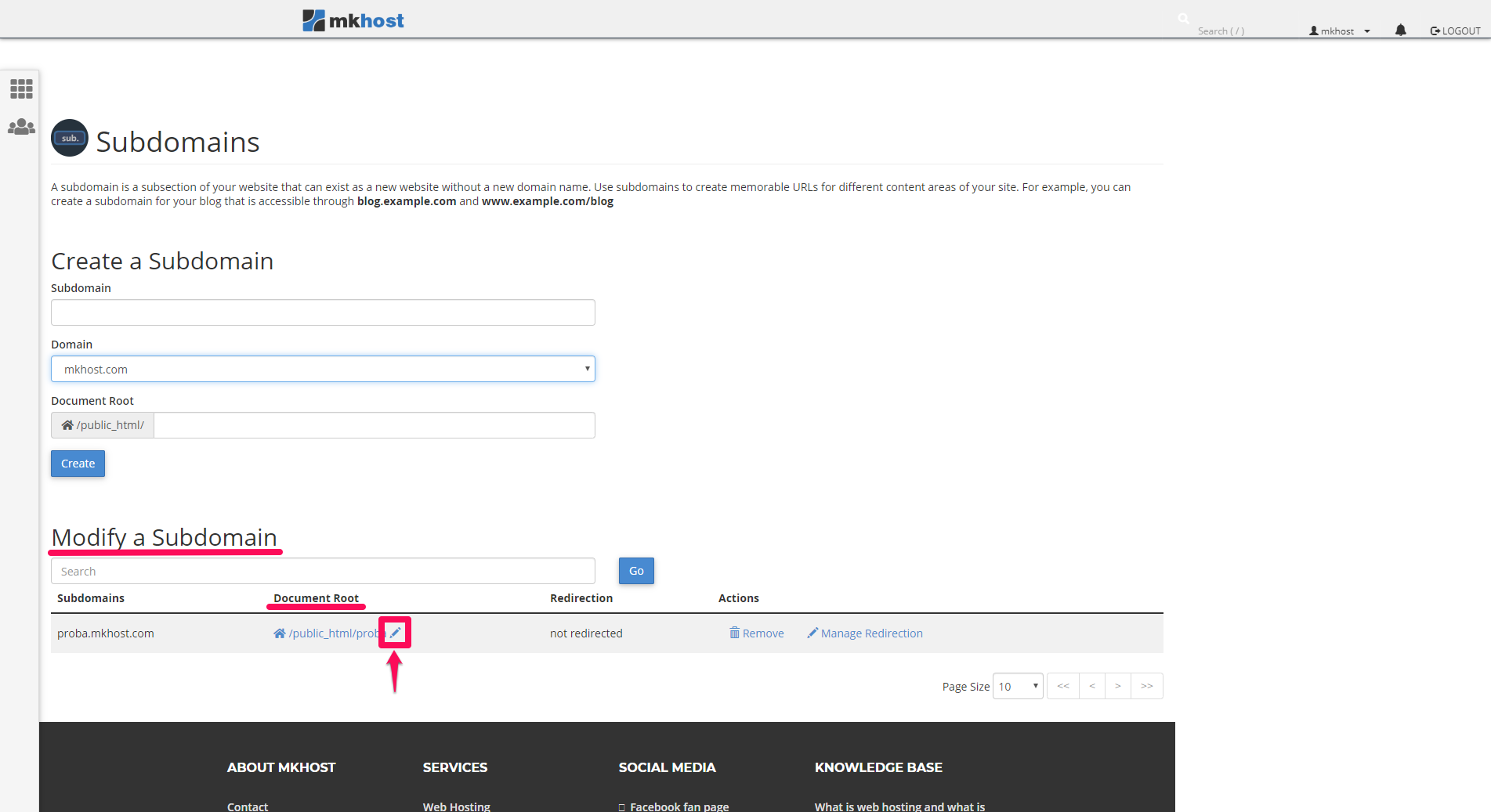Certain changes can be made to an existing subdomain. To change the path, first find the subdomain in the Subodomains -> Modify a Subdomain section, in the Document Root section, click on the edit icon.