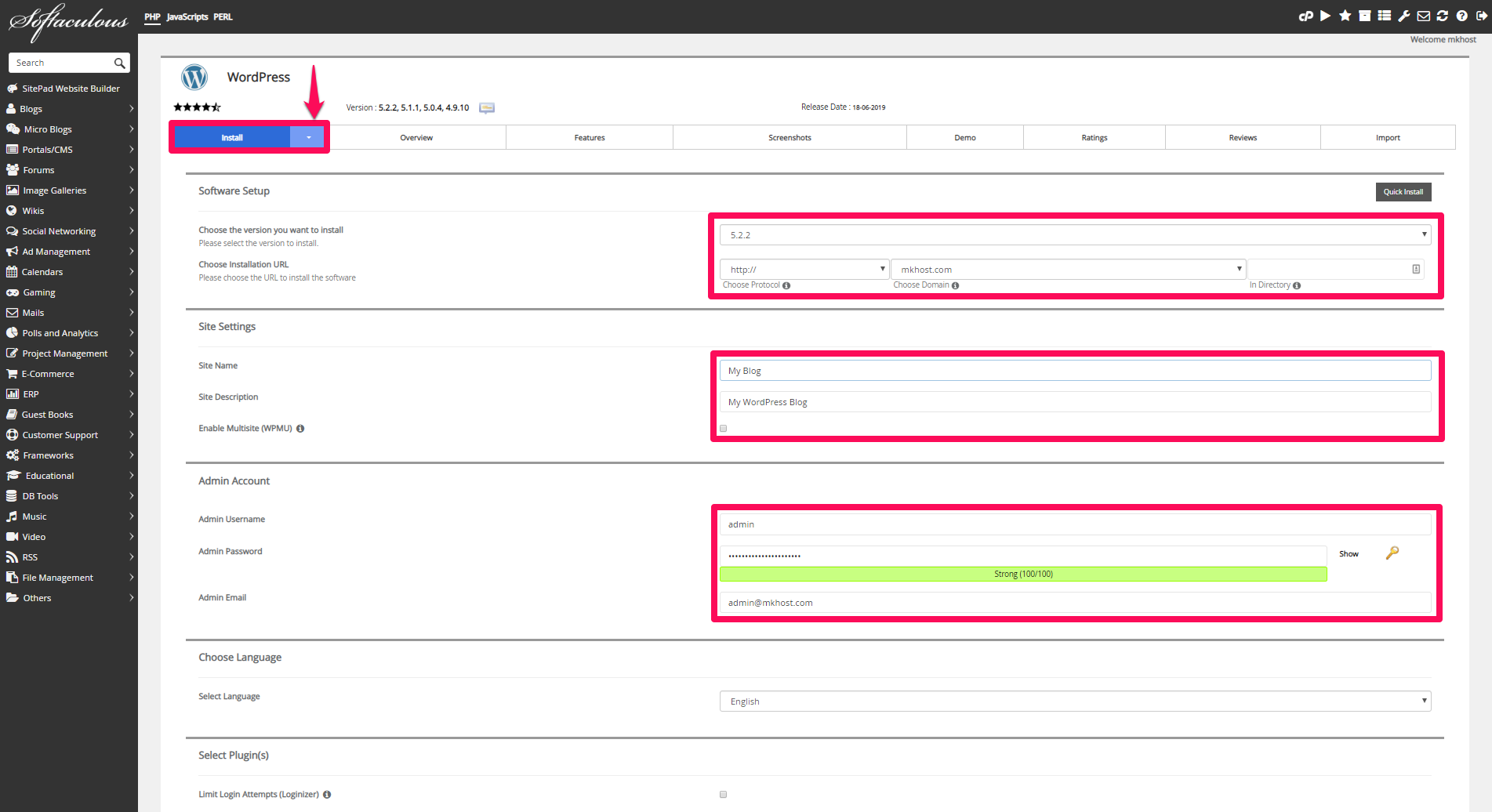 MKhost supports over 300 free scripts that you can easily install and use when creating your web site. Using Softaculous (an automated app installer) any hosting package user can easily install WordPress with just a few clicks.