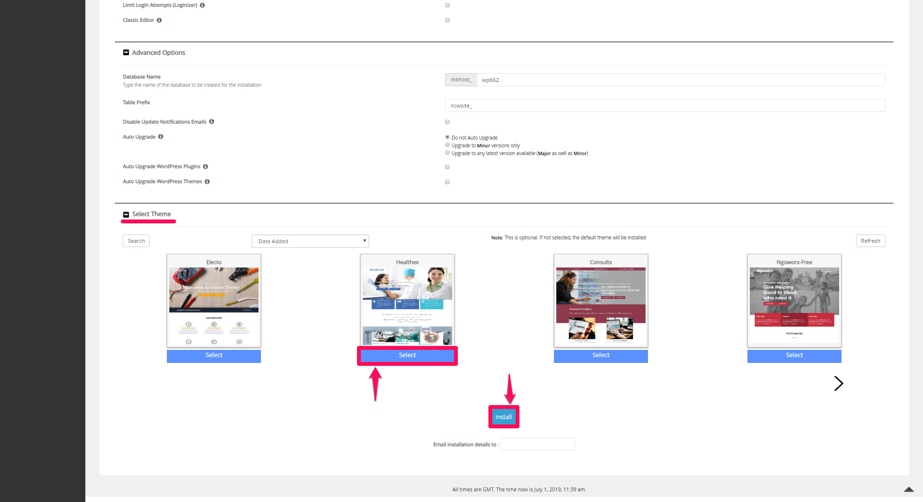 Before you're done with WordPress installation, in the Select Theme section, find the theme that suits you best, click Select and Install.