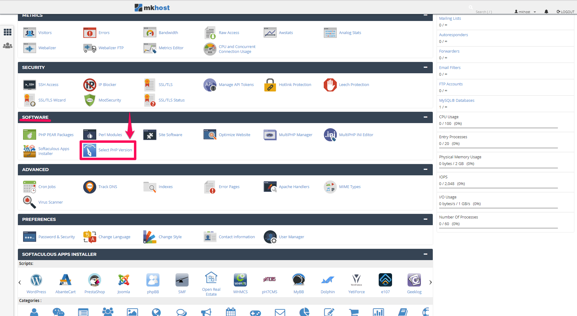 Login to your cPanel account with the appropriate username and password and in the Software section click on Select PHP Version