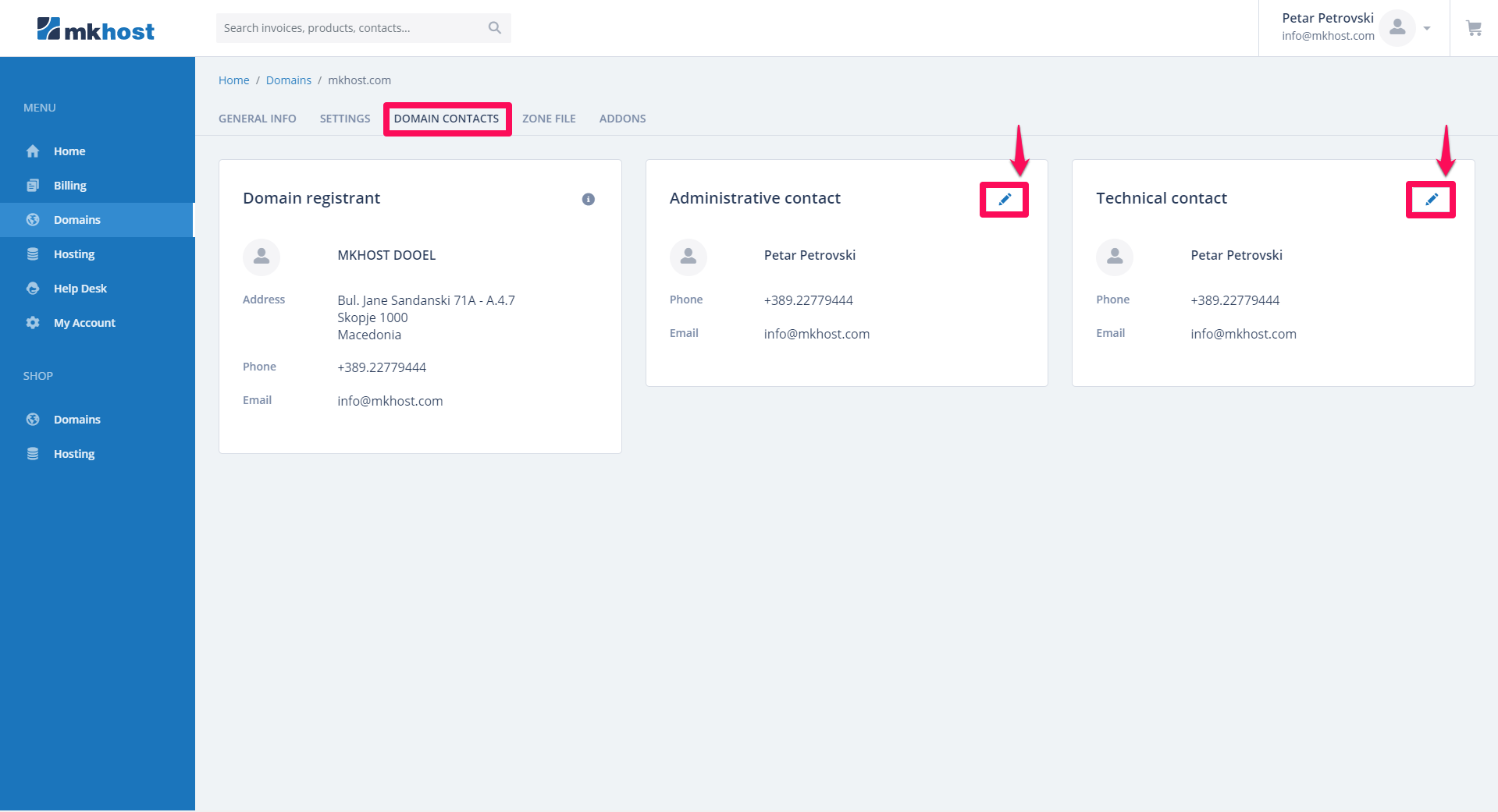 Click on the domain, and choose the Domain contacts tab. Click on the edit button then Edit contact info for admin or technical contact.