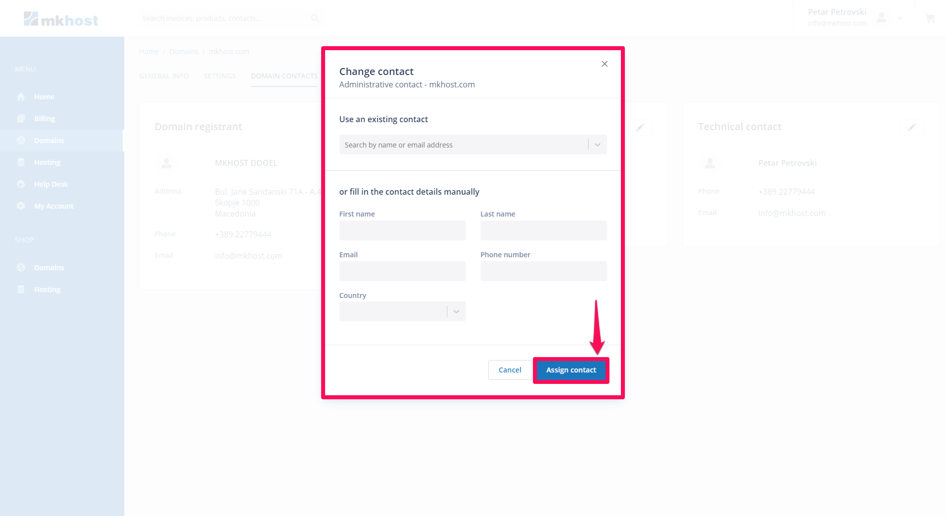 • If you want to change the email address of the contact, you will have to add a new contact with that email address and then specify the newly created contact as administrative or technical, which means you have to click on Change contact. Enter all the details for the new contact and click Assign Contact.