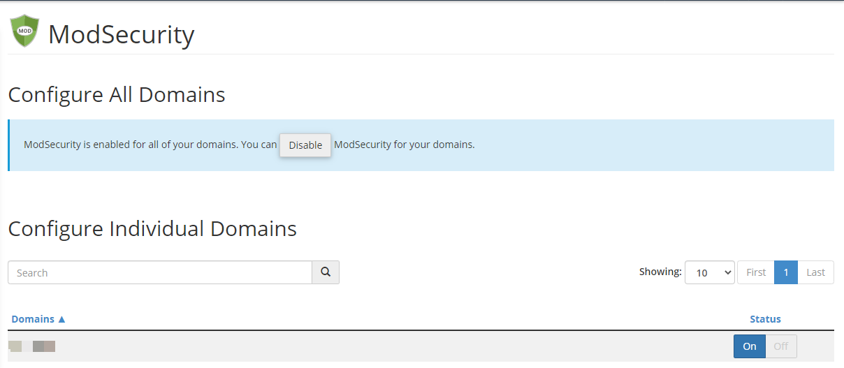 Со најава на cPanel во одделот Security ќе го пронајдеш ModSecurity модулот. Одбери домен за кој сакаш да го исклучиш ModSecurity и кликни на OFF. Сепак, и покрај тоа што ќе го исклучиш ModSecurity за соодветниот домен, од безбедносни причини можно е нашиот сервер одредени барања да бидат блокирани како би се заштитиле од поразличен вид на напад на твојот сајт.
